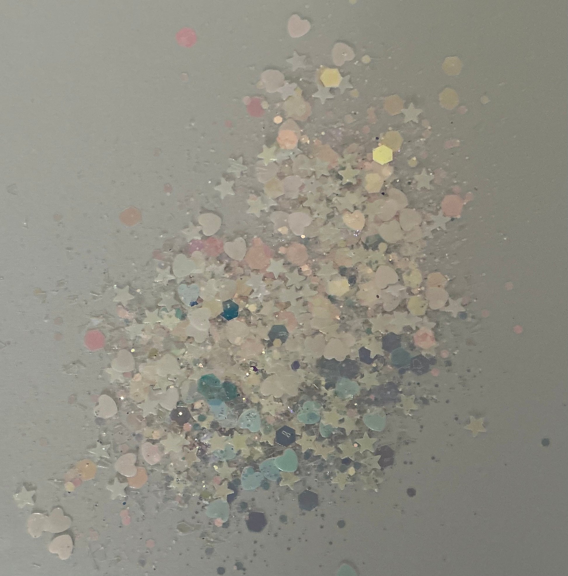 Size: Glitter Flakes, Hexagon mix (thickness: 36-70um) 3mm Heart, 3mm Star, 0.2/0.3/0.4/1/2.5mm