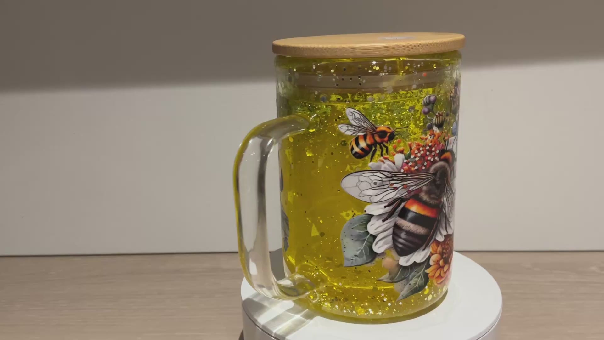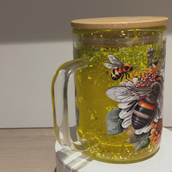 This 15oz glass handled cup is a charming addition to your collection, filled with dazzling honeybee-yellow glitter that adds a playful sparkle to every sip. Perfect for brightening up your morning routine or gifting to a friend who loves a little shine with their tea or coffee.